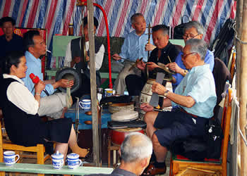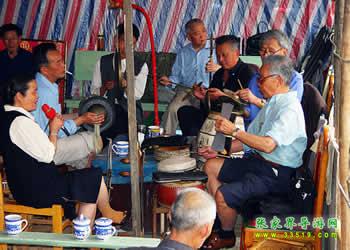 ![]() 圍鼓(含嗩吶)。又稱打鎦子、打排鼓,是民間紅白會(huì)中不可缺少的樂器。一般7人演奏,樂器有一鼓、一大鑼、一公鑼、兩副鈸、兩嗩吶。其詞曲紅白會(huì)通用,以鼓和嗩吶上系紅、白布為分別標(biāo)記(結(jié)婚不打“四字鈸”曲)。史傳的圍鼓詞有《撩子》、《火鋪》等,《撩子》分《一二三》、《閃翅》、《堆羅漢》、《反落花》等十章,《火鋪》也分《三槍》、《四進(jìn)門》、《八哥洗澡》、《蓮魚吐絲》等十章,嗩吶詞有《八十正宮》調(diào)等。在農(nóng)村,圍鼓是最普及的樂器,每逢紅白喜事都有圍鼓和嗩吶表演。