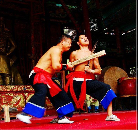 大庸氣功 大庸氣,堪稱武林奇葩,曾為祖國(guó)贏得聲譽(yù),海內(nèi)外享有極主名望。 大庸氣功是大庸各民族特別是土家族傳統(tǒng)體育項(xiàng) 目之了,分健體氣派、武術(shù)氣功兩類。前者有“返還 功”、“馬王推氣功”、“少林達(dá)摩醫(yī)療保健氣功” 等;后者有靜坐、壁虎、靈子、二指彈、碎石、松靜 、硬氣、五禽、五陽功等,尤以硬氣功著稱。大庸硬 氣功,歷史悠久,漢代相單程,明代覃后,清代劉明 燈,當(dāng)代湯子模、周鐵鞭、杜心武、趙繼書等都具有 超人硬氣武功。大庸土著民族在漫長(zhǎng)的反征服、反壓 迫斗爭(zhēng),博采武當(dāng)、少林南北派、昆侖派眾家武林精 華,創(chuàng)造出獨(dú)此一家的大庸硬氣功。 據(jù)傳,大庸硬氣功鼻祖是楚國(guó)鬼谷子?!?a class="insidelink" href="http://www.mdongbang.com/cityinfo/15580531721.html" title="永定區(qū)">永定縣 志》有關(guān)鬼谷子隱居天門山鬼谷洞潛心學(xué)《易》、傳 授方術(shù)的記載。到清代有武林高手朱茂嶺,隱居三岔 村北芭蕉灣洞,研究鬼谷氣功之術(shù),后收西溪坪胡口 子、余世萬(即“余通人”)為徙,傳其衣缽。余通 人將武術(shù)氣功系統(tǒng)整理,發(fā)揚(yáng)光大,播名于世。 新中國(guó)成立后,黨和政府十分重視民間氣功發(fā)掘 整理,并正式列為體育項(xiàng)目加以普及發(fā)展,今日大庸 市習(xí)練硬氣功達(dá)數(shù)萬人眾。永定區(qū)官黎坪村世有“硬 氣功之鄉(xiāng)”盛譽(yù),該村男女老幼,練功已蔚成風(fēng)氣, 其武師趙繼書,1979年先后參加全省和全國(guó)武術(shù)大賽 ,均獲一等獎(jiǎng),受到國(guó)家體委重視,同年7 月趙繼書 專程到北京給中央領(lǐng)導(dǎo)同志匯報(bào)表演。嗣后,隨同中 國(guó)武術(shù)代表團(tuán)和國(guó)家領(lǐng)導(dǎo)人先后兩次出國(guó),到盧森堡 、意大利、比利時(shí)、羅馬尼亞、馬其他和東南亞等國(guó) 家訪問。他表演的臥刀碎石、頭頂開石、雙鳳灌耳、 頭碰石柱、叉尖推磨等精彩節(jié)目,博得外國(guó)友人好評(píng) 。盧森堡一位榮獲國(guó)家獎(jiǎng)牌的武士,看了表演后連夜 來到中國(guó)大使館,將自己珍藏多年的獎(jiǎng)牌贈(zèng)送給他; 盧森堡國(guó)王主動(dòng)熱情走上臺(tái)與趙繼書熱情擁抱,連連 稱贊:“了不起!了不起!國(guó)際氣功大師!”并把珍 藏紀(jì)念章一枚贈(zèng)送給趙繼書。一位法國(guó)朋友十分贊賞 說:“中國(guó)的氣功,稱為全人類的寶貴財(cái)富,是有科 學(xué)道理的。”自此,大庸硬氣功譽(yù)滿全球。湖南瀟湘 電影制片廠專門拍攝了彩色紀(jì)錄片《大庸氣功》。 大庸硬氣功共有二十多個(gè)項(xiàng)目,最有影響的是: 腹臥鋼叉 由二人在地面扶住一根叉尖朝上的三 股鋼叉,叉尖猁鋒利,然后一個(gè)俯身叉尖,尖抵腹部 ,待其四肢平展懸空,扶叉二人轉(zhuǎn)動(dòng)鋼叉,謂之推磨 。表演時(shí),要求臥叉者運(yùn)氣于腹,氣意集中,稍有大 意,叉即穿腹而過。 臥刀破石 先固定兩把大刀,刀口朝上,臥刀者 運(yùn)氣后,由其他人抬臥于刀口上(有仰臥、俯臥兩種) ,然后在臥刀者腹部或背部置一碩大石條(約數(shù)百斤) ,一人或兩人輪大鐵錘狠擊石條直至斷裂破碎為止。 釘?shù)洞财剖?地上倒一層碎玻璃片,一人仰臥其 上;然后腹上置釘床,又一人仰臥釘床上,再于第二 人腹上置釘床,第三人仰臥刀床上,腹部上壓一塊數(shù) 百斤大條石,由人掄錘狠砸,至石破為止。 銀槍刺喉 用一根兩頭安有鋒利槍頭的鋼槍,抵 置兩位表演者喉部,然后相對(duì)發(fā)力,至槍桿抵成彎弓 形而喉部安然無恙。 徙手?jǐn)嗍?表演者將堅(jiān)滑如鐵一塊卵石置于石凳 (地)上,然后運(yùn)氣于掌或指擊斷(碎)卵石。 踢腿斬石 表演者運(yùn)氣于腿,以腿踢斷石條。一 般可踢斷15公分以上厚度的麻石條或青石條。 胸部打刀 將鋒利大刀刃口置于胸部肌肉上,用 一根拳頭粗木棒猛擊刀背,至棒斷而胸部無傷。 新中國(guó)成立以來,大庸民間武術(shù)與民族體育逐漸 融為一體,發(fā)揮著提高人民身體素質(zhì)、弘揚(yáng)中華武術(shù) 傳統(tǒng)和增進(jìn)國(guó)際友誼重大作用。除硬氣功外,還有數(shù) 十種武術(shù)形式散見于民間武術(shù)體育活動(dòng)之中。如打飛 棒、扭扁擔(dān)、抵搭斗杠、擠油渣、甩抱腰、舉石鎖、 板牛角(一種斗牛形式)等等。其特點(diǎn)是因地制宜, 不分場(chǎng)地,凡田園地角院壩集鎮(zhèn),都是習(xí)武練功、開 展活動(dòng)的處所,頗具泥土氣息。擬或以生活中某些動(dòng) 作和動(dòng)物的某種形態(tài),稍加模仿演繹,便成某一獨(dú)特 武術(shù)形式。如天門武術(shù)功夫大師余道人所創(chuàng)造的“宮 天梳”、“巖燕樸天門”等;也有就地理特點(diǎn)創(chuàng)造某 種武功形式的,如“蕩藤”等。 以上部分圖片均來自互聯(lián)網(wǎng),出處不詳,請(qǐng)作者與本站聯(lián)系。 ![]() |