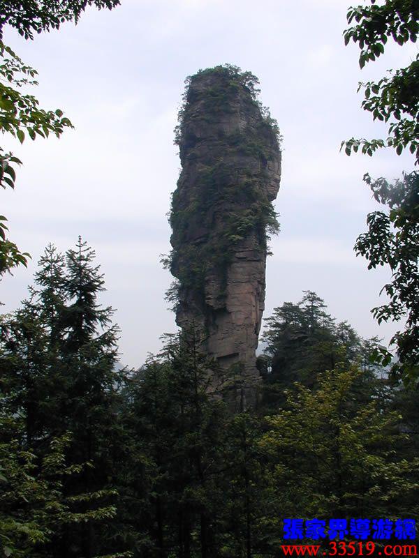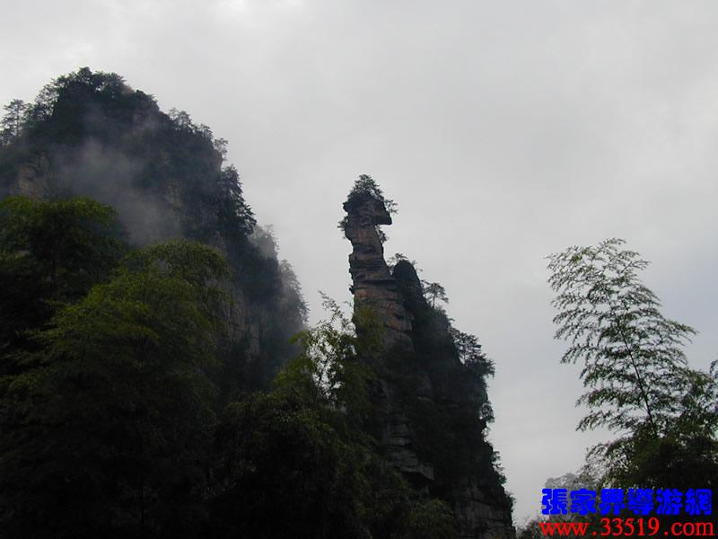 (南天一柱)現在我們前方幽谷峰林中有一高達200多米的孤峰,宛如擎天玉柱。上部灌木點綴,中部巖身赤裸,下部樹木遮掩,峰體渾圓、偉岸,因立南天門下而得名?!?/p>