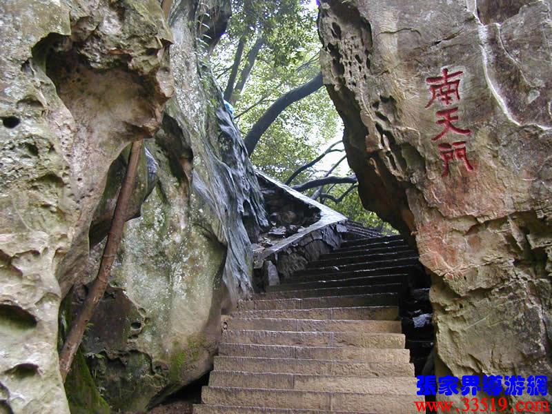 (南天門)(前行20米)現請大家抑頭望,可見一洞門,此門高約30米、寬4米左右,由游道兩側的兩座石峰斜傾拱峙而成。門右邊不遠處一峰高約20米,峰頂如人頭,有臉有面,似把門將軍。