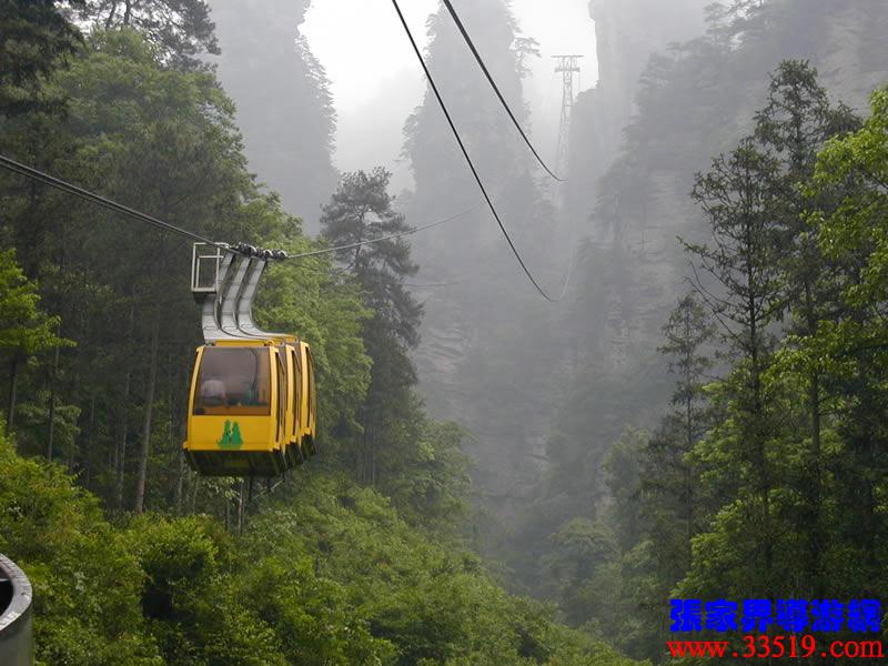 (索道站)現在,我們就要乘索道下山了。黃石寨(黃獅寨)索道是1995年5月至1997年9月臺灣證吉興業(yè)有限公司與張家界公園管理處合資興建的我市第一條觀光索道。索道線路水平距863,高差431米,運行速度每秒8米,單向小時運量948人,設備全部從法國波馬公司引進,總投資4000多萬人民幣。黃石寨(黃獅寨)索道的建成,為公園開辟了一條空中游覽線,填補了張家界無觀光索道的空白。古詩說:會當凌絕頂,一覽眾山小。乘索道觀張家界公園,別是一番感受。
