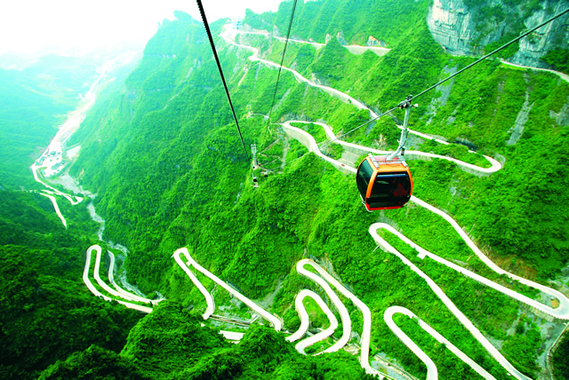 ②、張家界天門山索道為全世界最長的觀光客運(yùn)索道,索道線路斜長7455 米,索道運(yùn)行速度為每秒 6 米,單程運(yùn)行時(shí)間約28分鐘。上、下站水平高差1279米主要設(shè)備均由法國POMA公司原裝進(jìn)口,索道鋼繩來自于法國, 98 個(gè)吊廂來自瑞士 CWA 公司,單個(gè)造價(jià)高達(dá) 20 萬元人民幣。有嚴(yán)重心臟病或恐高癥等患者不建議乘坐;