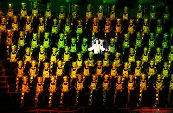 以此基礎(chǔ)進(jìn)行了藝術(shù)再創(chuàng)造,悲傷、歡樂、笑容、淚水交合成一個(gè)曲折動(dòng)人的故事。整場演出體現(xiàn)人物細(xì)節(jié),以個(gè)性化的敘事結(jié)構(gòu)給人以親近感和頭尾呼應(yīng)的完整感。汲取世界豐富的音樂文化元素和表現(xiàn)形式,輔之以現(xiàn)代高科技的舞臺(tái)特效技術(shù),對(duì)世界音樂歌舞劇的一次成功的創(chuàng)新,成為中國山水實(shí)景演出的劃時(shí)代巨獻(xiàn)。