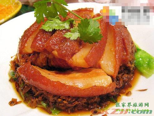 ![]() “土家扣肉“是《張家界》土家人待客的一道主菜、和豬肘子齊名。一般只有在當(dāng)?shù)氐娜宿k酒席或大型活動的時候才會上用作主菜。土家扣肉的做法均采用五花豬肉,經(jīng)過煮、炸、蒸等多道工藝制成,上席時肉的下面一般都會用干咸菜(或者豆豉)鋪底。 ![]() |