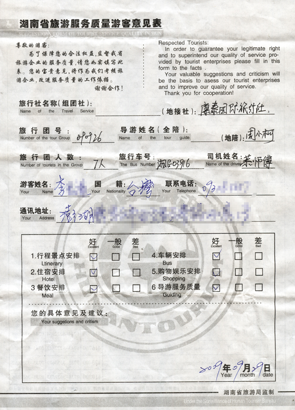 ![]() 9月26日臺灣李先生一行7人接待質(zhì)量反饋單:
