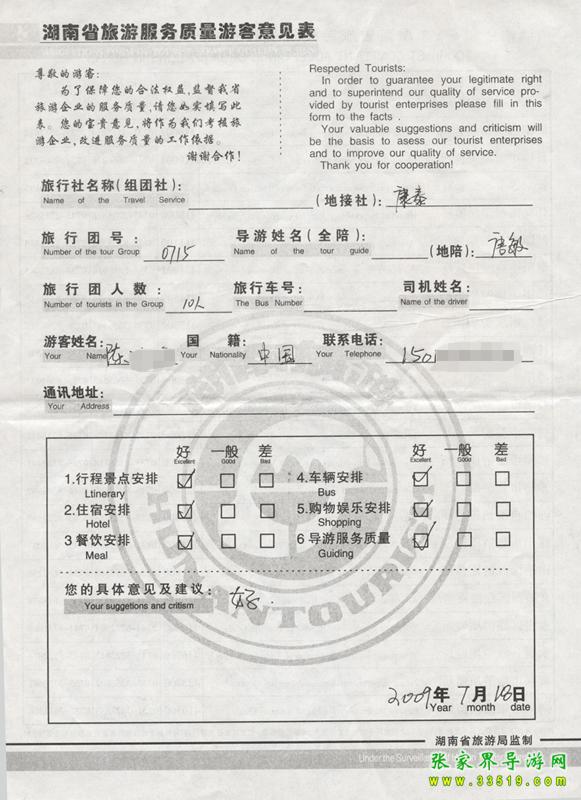 ![]() 2009年陳女士一行10質(zhì)量接待反饋單: ![]() |