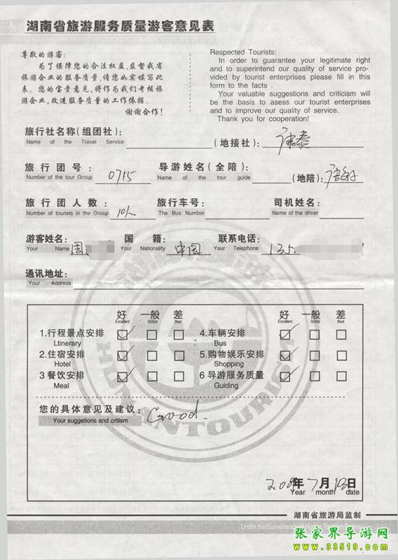 ![]() 2009年7月15日周女士一行10人質(zhì)量接待反饋單: ![]() |