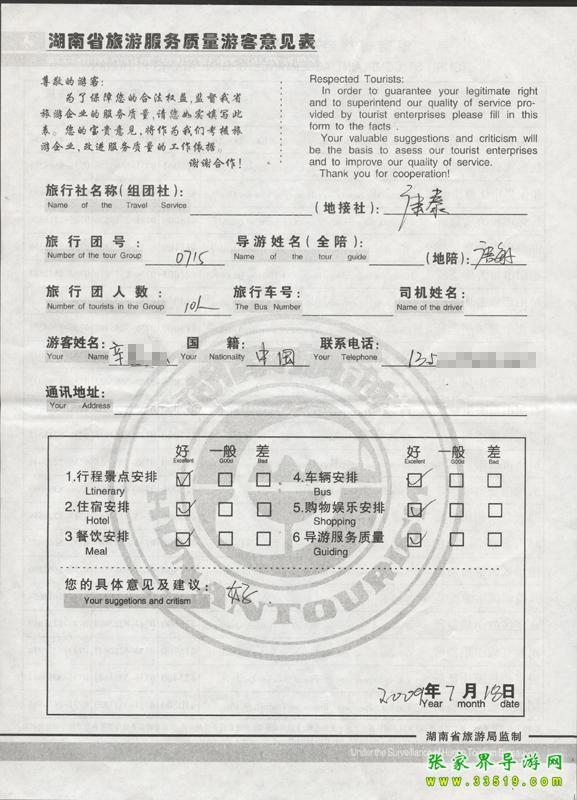 ![]() 2009年7月15日辛先生一行10人質量接待反饋單: ![]() |