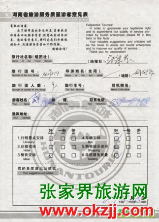 ![]() 2009年11月14日袁先生一行9人旅游接待質(zhì)量反饋單: