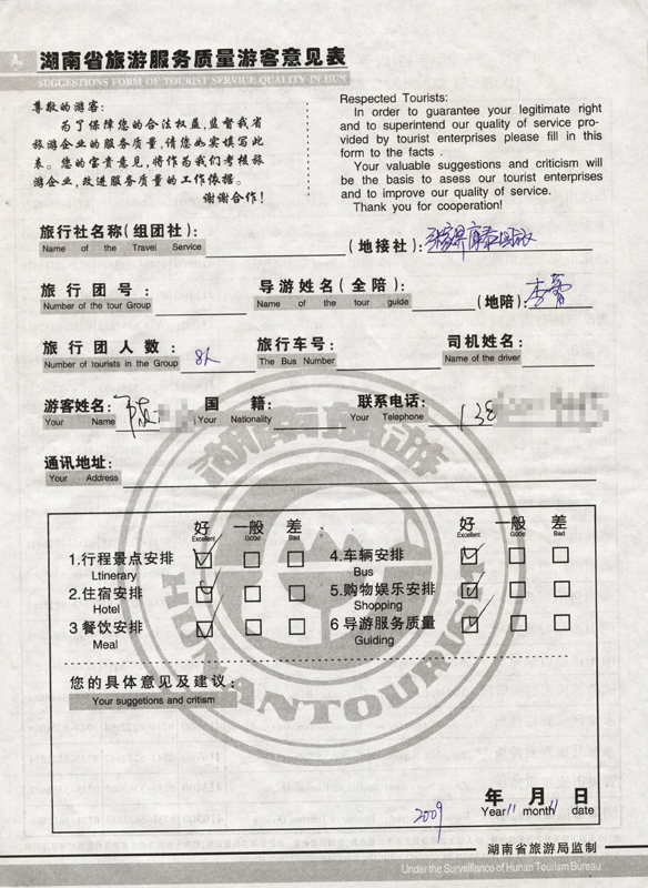 ![]() 2009年11月11日陳先生一行8人旅游接待質(zhì)量反饋單: ![]() |