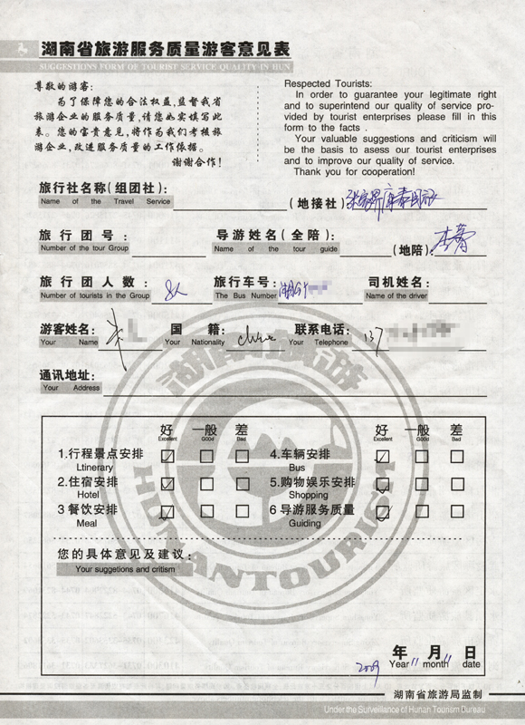 ![]() 2009年11月11日朱先生一行8人旅游接待質(zhì)量反饋單: ![]() |