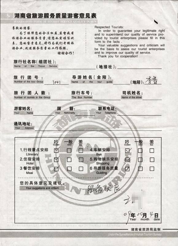 ![]() 2009年10月1日王先生一行質(zhì)量接待反饋單: ![]() |