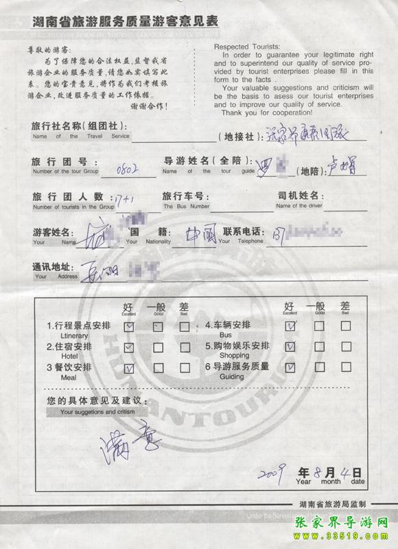 ![]() 2009年8月2日岳陽龍先生一行18人接待質(zhì)量反饋單: