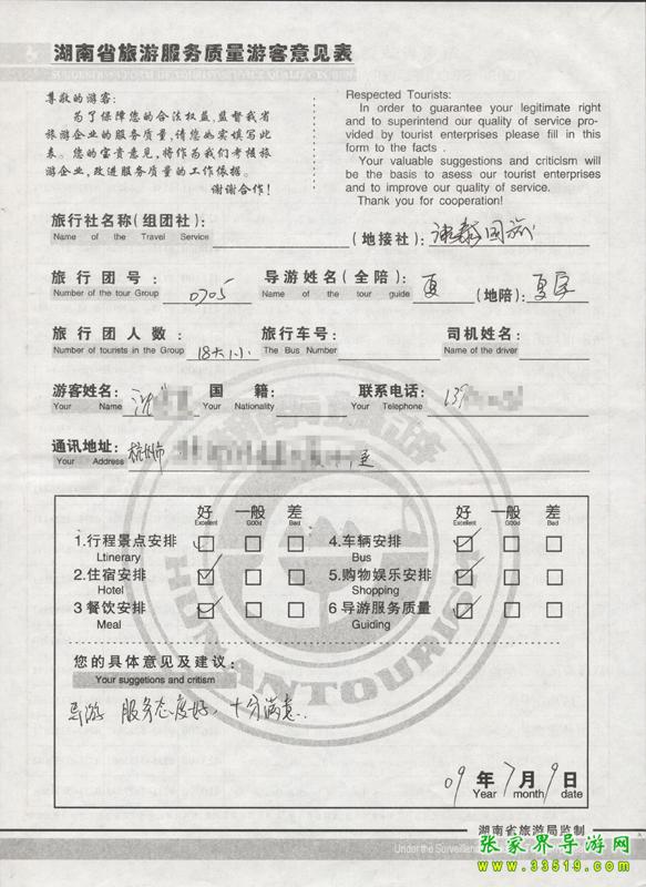 ![]() 2009年7月5日杭州沈先生一行18人質(zhì)量接待反饋單: ![]() |