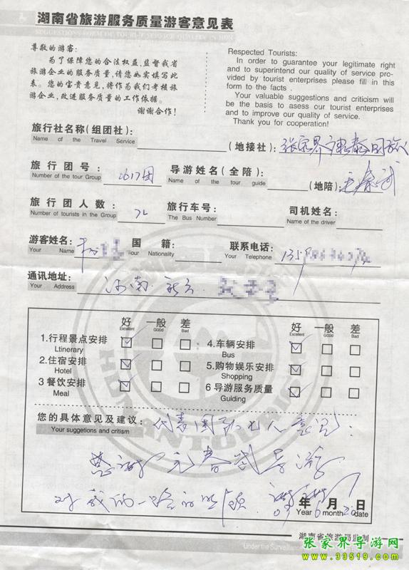 2009年6月17日楊女士一行7人接待質量反饋單: