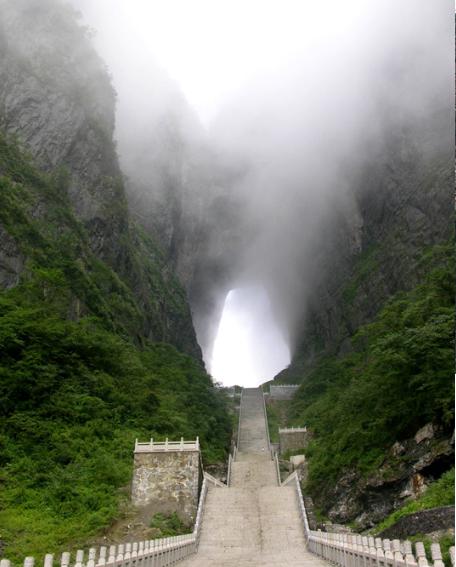 天門山上有一個天門洞,2006年03月,曾有俄羅斯之戰(zhàn)斗機在此表演飛躍天門洞的表演,還造成滿大的轟動。上天門洞之前,必須先征服999個階梯,經(jīng)過一番努力終于登上天門洞之后,突有豁然的感覺,人在山上,卻仍然在洞中,從這里更可以鳥瞰整個張家界市的景色。用完晚餐后,即乘車從張家界回車長沙。